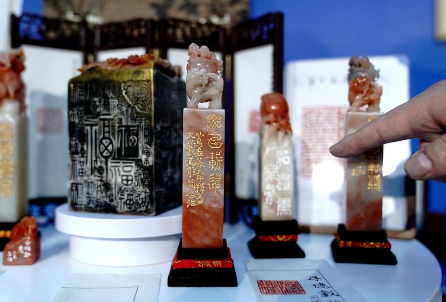 7日、輸入博の遼寧省エリアに展示された遼寧省の無形文化遺産に登録されている「金州鳥虫篆刻(てんこく)」の作品。(上海=新華社記者/張建松)