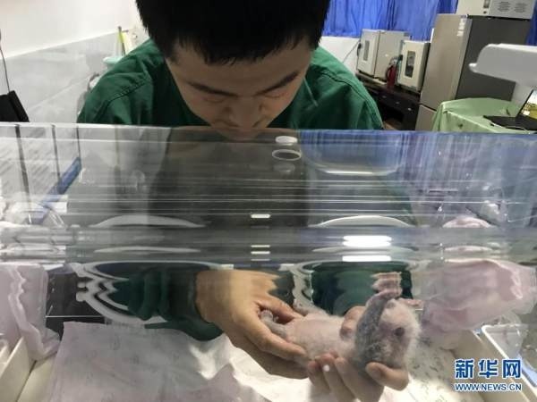 23日、赤ちゃんパンダを世話する飼育員。(重慶=新華社配信)
