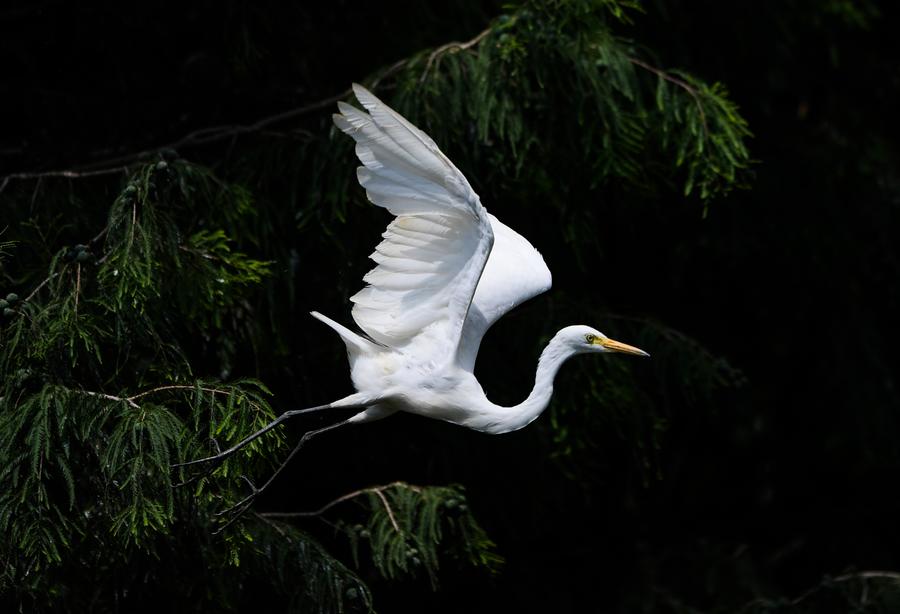 7日、海洪湿地公園内を飛ぶコサギ。(昆明=新華社記者/陳欣波)