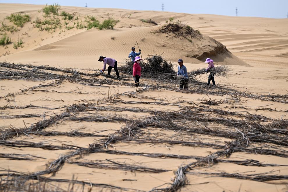 内モンゴル自治区オルドス市ダラト旗のクブチ砂漠で防砂に取り組む作業員。(6月7日撮影、フフホト=新華社記者/李志鵬)