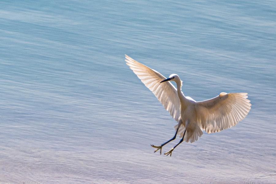 葛洲ダム下流付近の水域で餌を取るコサギ。(宜昌=新華社記者/肖芸九)