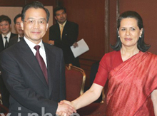 インドを公式訪問中の温家宝総理は10日、首都ニューデリーの滞在先ホテルで、インド・コングレス党のガンジー党首と会見した。