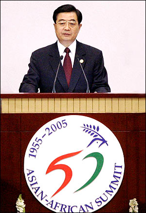 胡錦濤国家主席は22日、インドネシアの首都ジャカルタで開かれたアジア・アフリカ会議(バンドン会議)首脳会議で「時代と共に進み、先人の歩みを継いで未来を開き、アジア・アフリカの新しいタイプの戦略パートナーシップを築こう」と題して演説した。