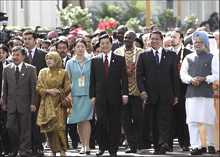 ジャカルタでのアジア・アフリカ首脳会議に参加した各国首脳は24日、西ジャワ州のバンドンに移り、バンドン会議50周年を祝った。各国首脳は半世紀前の参加首脳に倣い、当時の代表団が泊まったホテルから「アジア・アフリカ通り」沿いに、会議の舞台となった「独立記念館」まで徒歩で移動。当時と同じ道を踏みしめることで歴史を思い起こし、「団結・友好・協力」のバンドン精神を発揚した。独立記念館前で記念撮影したほか、アジア・アフリカ首脳会議で議長を務めた、インドネシアのユドヨノ大統領と南アフリカのムベキ大統領が「アジア・アフリカ新戦略パートナーシップ宣言」に署名した。