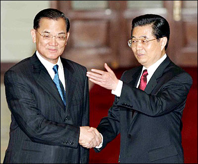 胡総書記はまず歓迎の挨拶をした。胡主席は歓迎の言葉の中で「きょうの会見はわれわれ両党主要指導者による歴史的会見である。あなた方の来訪は中国共産党と中国国民党の関係史上の大事であり、現在の(中国大陸部と台湾の)両岸関係における大事である。あなた方が大陸に一歩を踏み入れてから、われわれ両党は共に歴史的に重要な一歩に踏み出した。この一歩は両党交流が新しい発展段階に入ったことを示しており、またわれわれ両党が共に両岸関係の発展を促進させたいと願っている決意と誠意を体現している。われわれが共に踏み出したこの一歩は、必ずや両岸関係発展の歴史において記されるであろう」と語った。