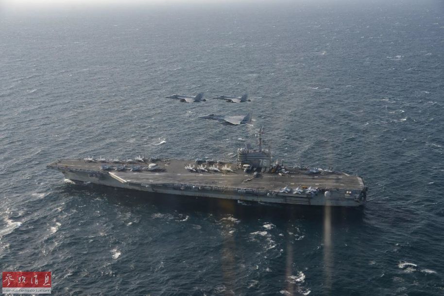 米軍F-18戦闘機と日本のF-15J戦闘機、米海軍原子力空母「レーガン」の上空を飛行。