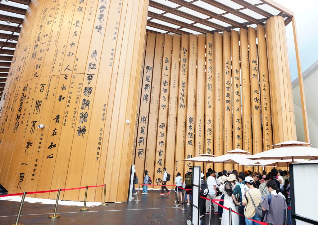 11日、大阪・関西万博の中国パビリオン前で入場を待つ来場者。(大阪=新華社記者/賈浩成)