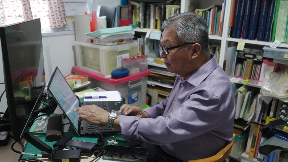 8月23日、シンガポールの自宅で資料を確認する林少彬氏(新華社記者・舒暢撮影)