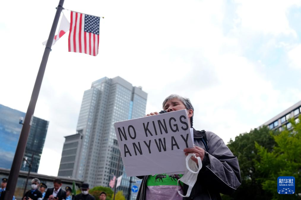 10月28日、東京の首相官邸前で、プラカードを掲げ抗議活動に参加する日本の市民。(新華社記者/賈浩成撮影)