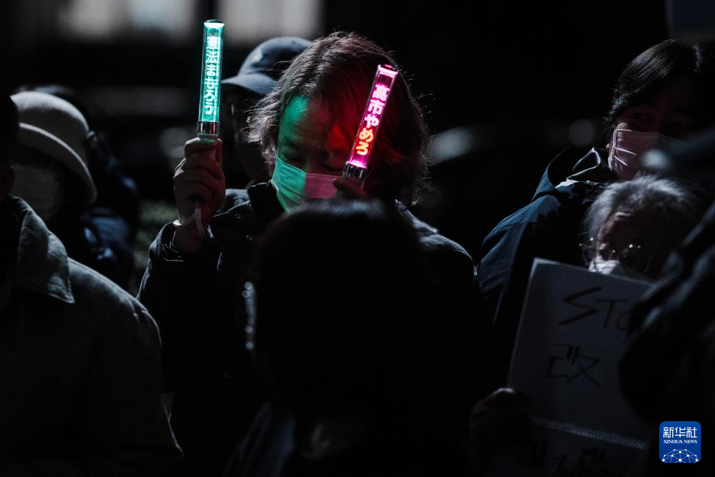 2月27日、東京の首相官邸前で抗議する市民(新華社記者 賈浩成 撮影)