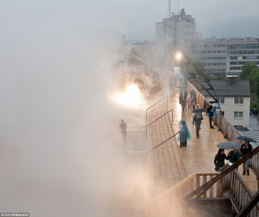 屋上で「雲の中を歩く」 日本人アーティストの作品