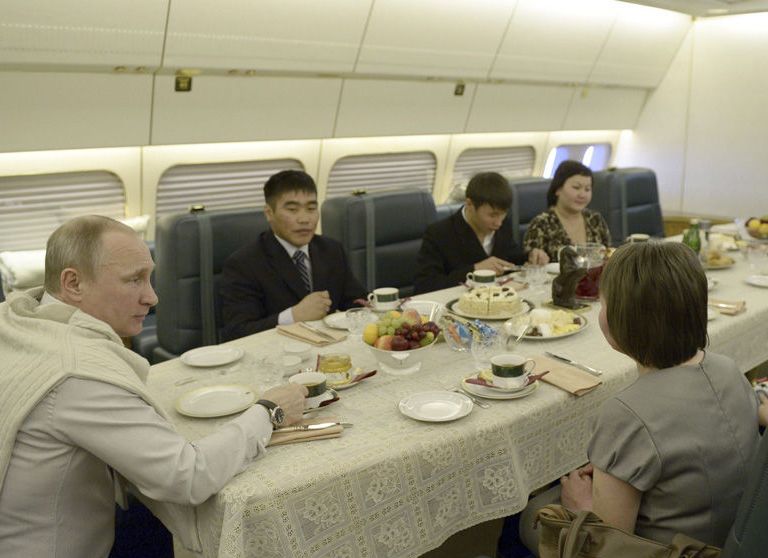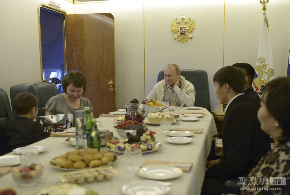 海外メディアの1月6日の報道によると、ロシアのプーチン大統領は2013年12月31日、ハバロフスクに向かう専用機で、洪水の災害者の家族をもてなした。