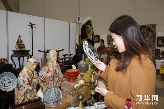 骨董品を選ぶ来場者。