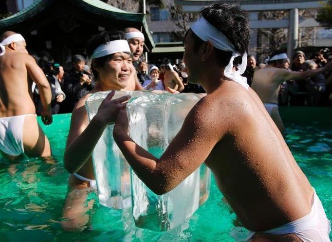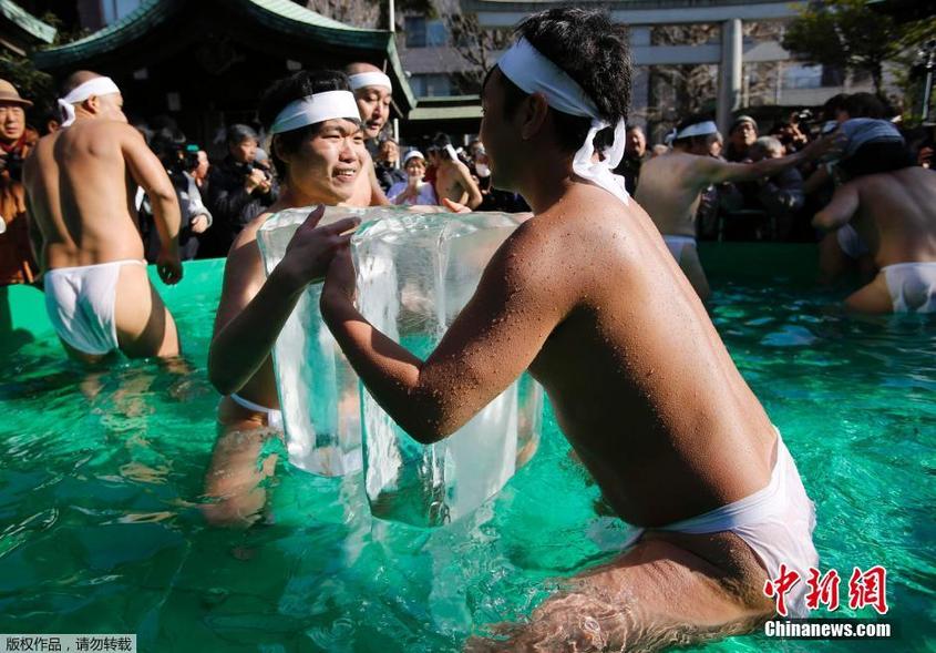 日本の東京で現地時間2014年1月12日、神道の修行者と体力に挑戦する人たちが鐵砲洲稲荷神社の冷たいプールの中で、自分の精神と体を磨いた。