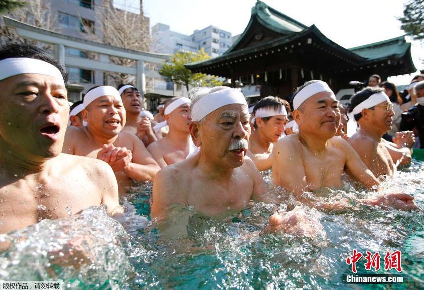 日本の東京で現地時間2014年1月12日、神道の修行者と体力に挑戦する人たちが鐵砲洲稲荷神社の冷たいプールの中で、自分の精神と体を磨いた…