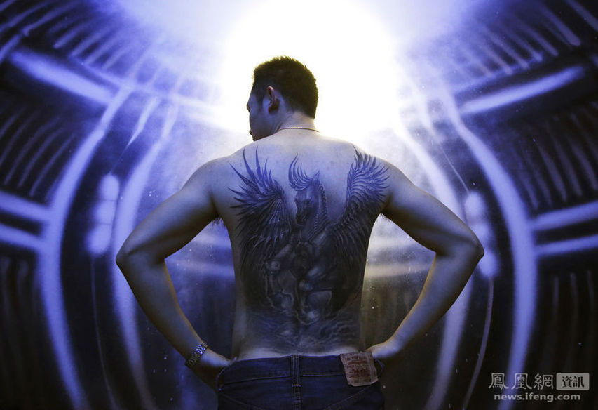 李生さんは6日間かけて背中に馬の刺青を入れた。(1月19日、北京)