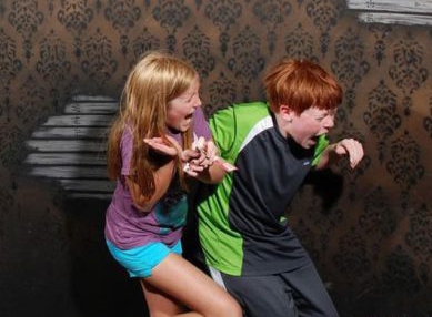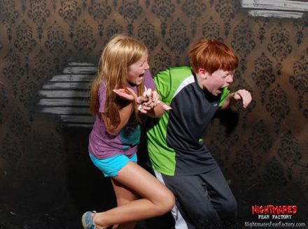 お化け屋敷の中で怖がる人たちの表情。 お化け屋敷の中で怖がる人たちの表情