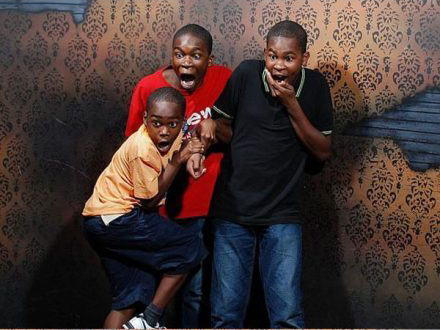 お化け屋敷の中で怖がる人たちの表情。 お化け屋敷の中で怖がる人たちの表情