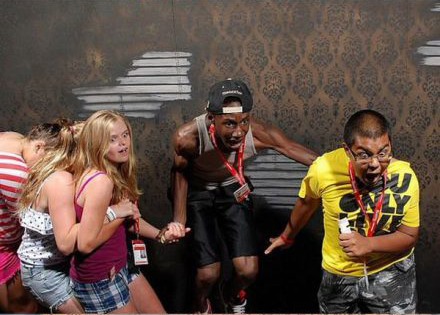 お化け屋敷の中で怖がる人たちの表情