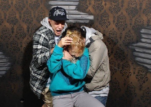 お化け屋敷の中で怖がる人たちの表情。 お化け屋敷の中で怖がる人たちの表情