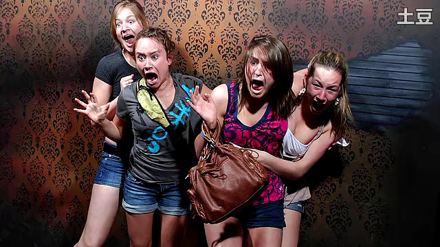 お化け屋敷の中で怖がる人たちの表情。 お化け屋敷の中で怖がる人たちの表情