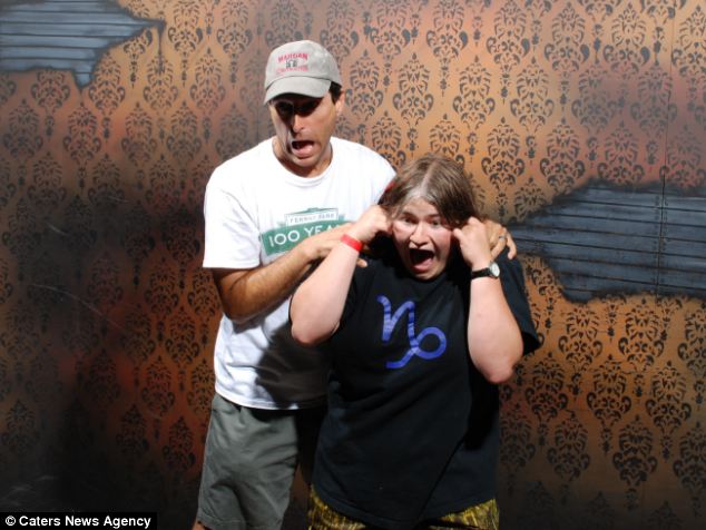 お化け屋敷の中で怖がる人たちの表情。 お化け屋敷の中で怖がる人たちの表情