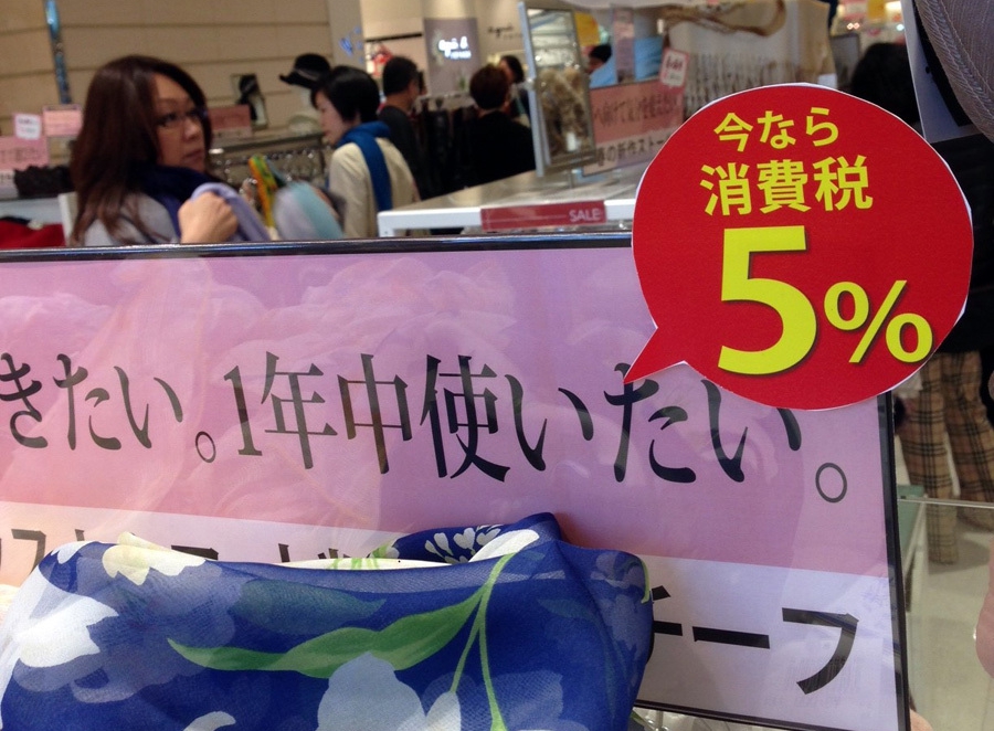 日本の百貨店マルイに入ると、「今なら消費税5%」の字があちこちで見られる。女性用スカーフの売り場では「一年中使いたい」とうたっている。