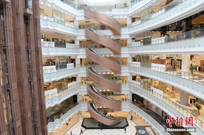 上海市南京東路でオープンしたデパート内で、10基の螺旋状エスカレーターが登場した。上から俯瞰すると、弧を描きながら稼働するエスカレーターはバネのように重なり、特殊な視覚効果を演出している。