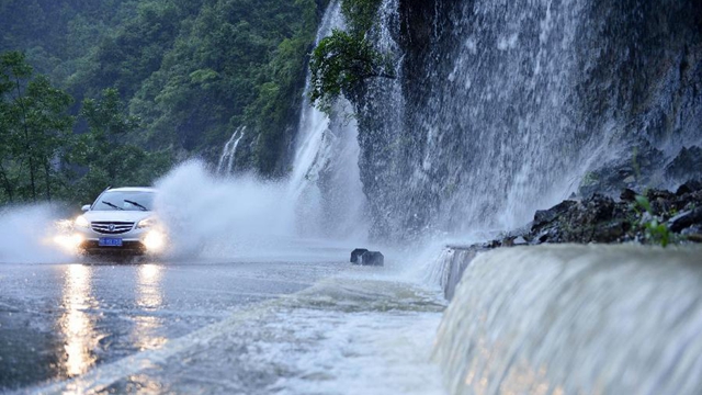 車が6月17日、水に覆われた国道209号の湖北省宣恩県高羅鎮の区間を走行。6月16−17日にかけて、重慶市、湖北省、安徽省、江蘇省、上海市などで大雨が降り、江蘇省と上海市では局地的に豪雨が降った。
