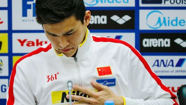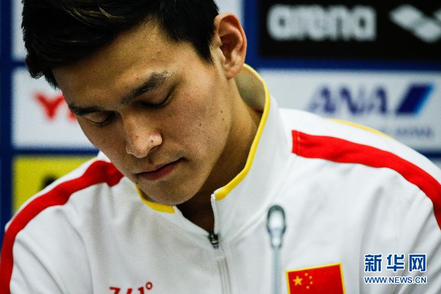 8月9日、記者会見に出席した孫楊選手。9日に行われた世界水泳選手権カザン大会で、孫楊選手は心臓に違和感があるとして男子1500メートル自由形決勝を棄権した。