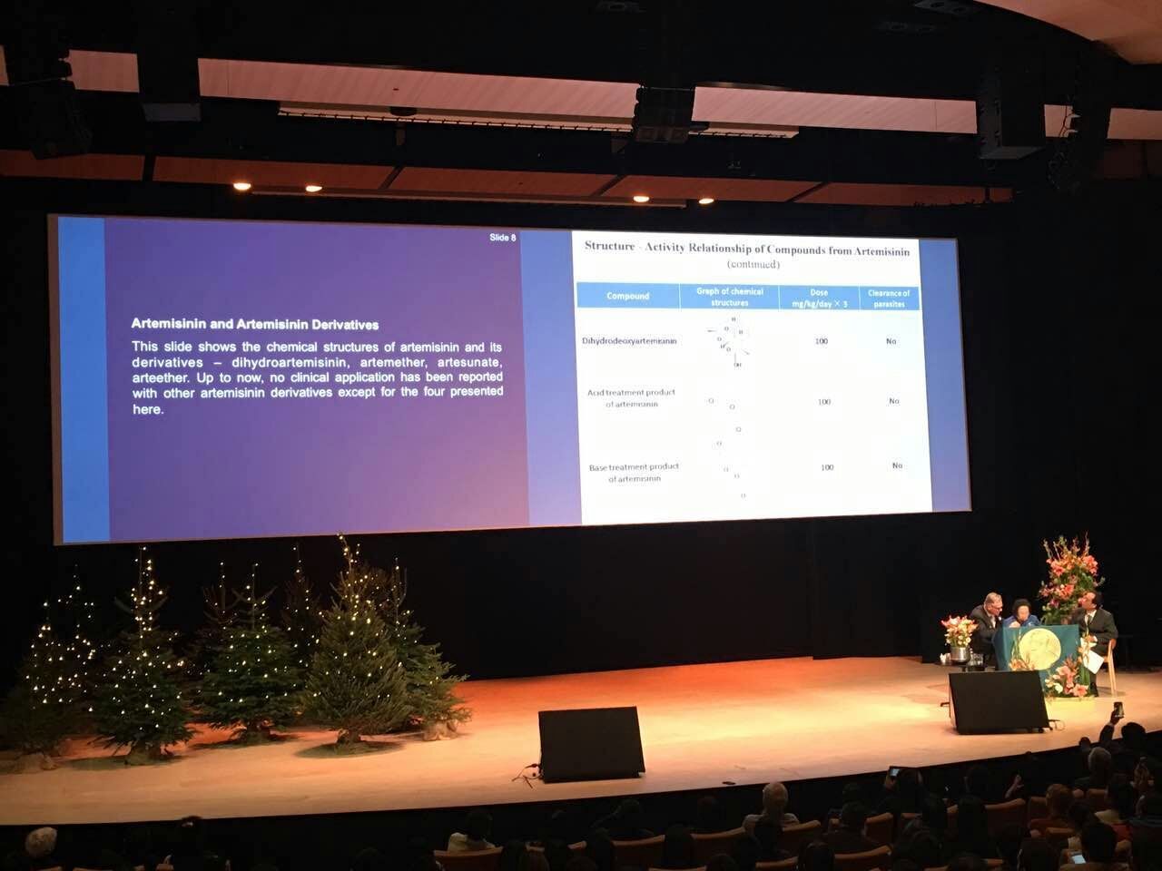 屠氏は講演の中で、ノーベル委員会による2015年ノーベル生理学医学賞の授与に感謝の意を表し、受賞は個人のみの栄誉ではなく中国人科学者への奨励であることを強調した。屠氏はまた、アーテミシニンは伝統的な漢方が世界に捧げる贈り物だと述べた。