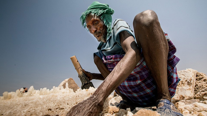 エチオピア北部にあるダナキル凹地は「地獄の門」と言われ、世界一温度が高い場所である。100年以上にわたり、この場所は塩の産地として有名だが、仕事をする場所としては最悪である。温度は50度以上もあり、60度に達することもあるため、作業員は高温になる昼間ではなく夜が明ける前に作業を行う。