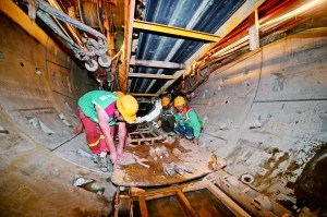 槐房再生水処理施設のパイプライン内で、作業員が施工中。