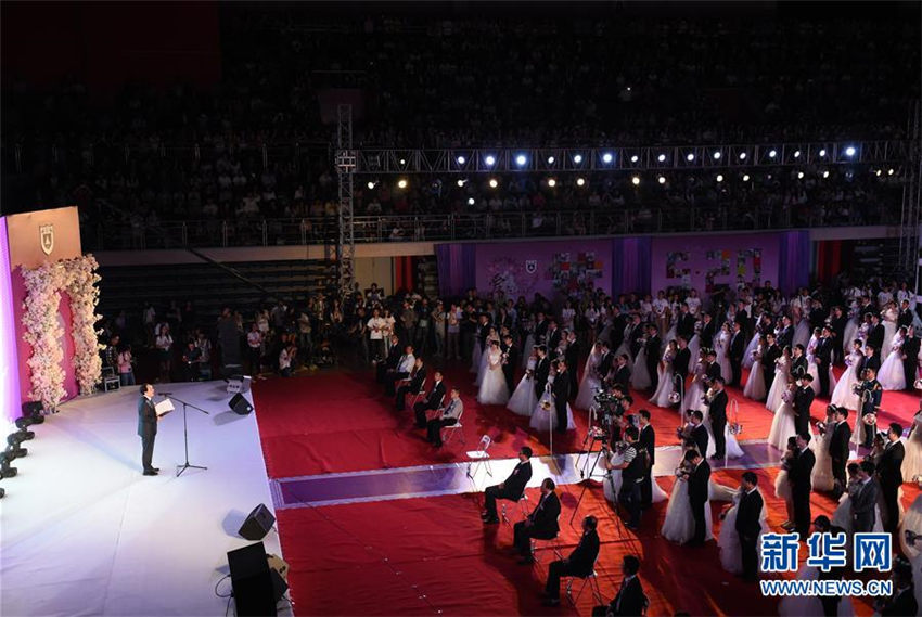 5月20日、集団結婚式会場に入場するカップルたち。