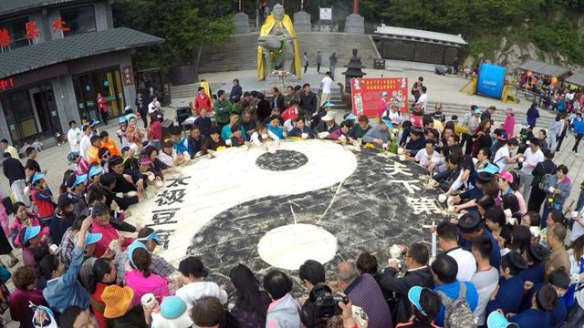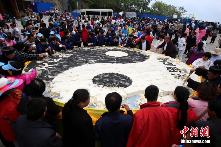 河南省洛陽市の道教の聖地・老君山で22日、直径5メートルの「天下第一太極豆腐」が中天門広場に登場した。この豆腐は老君山の参拝客が寄贈した穀物で作ったもので、試食会が催された。この円形の豆腐の重さは2100キロで、大豆を1000キロ以上使用した。太極図が描かれ、天下第一太極豆腐」と書かれている。現地人は験を担ぎ、「豆腐」を奪うことで「頭福(最高の福)」を奪う。試食会が始まってから2時間余りで、豆腐は観光客に食べ尽くされた。現場ではさらに豆花と調味料が出された。観光客は「欒川豆腐」の独特な魅力を味わった。現場の作業員は、同日出された碗と箸の数から、約5000人が本場の欒川豆腐を食べたと大まかに見積もった。欒川豆腐は崩れにくく、歯ごたえが快いことで知られる。写真は「天下第一太極豆腐」を囲む人々。
