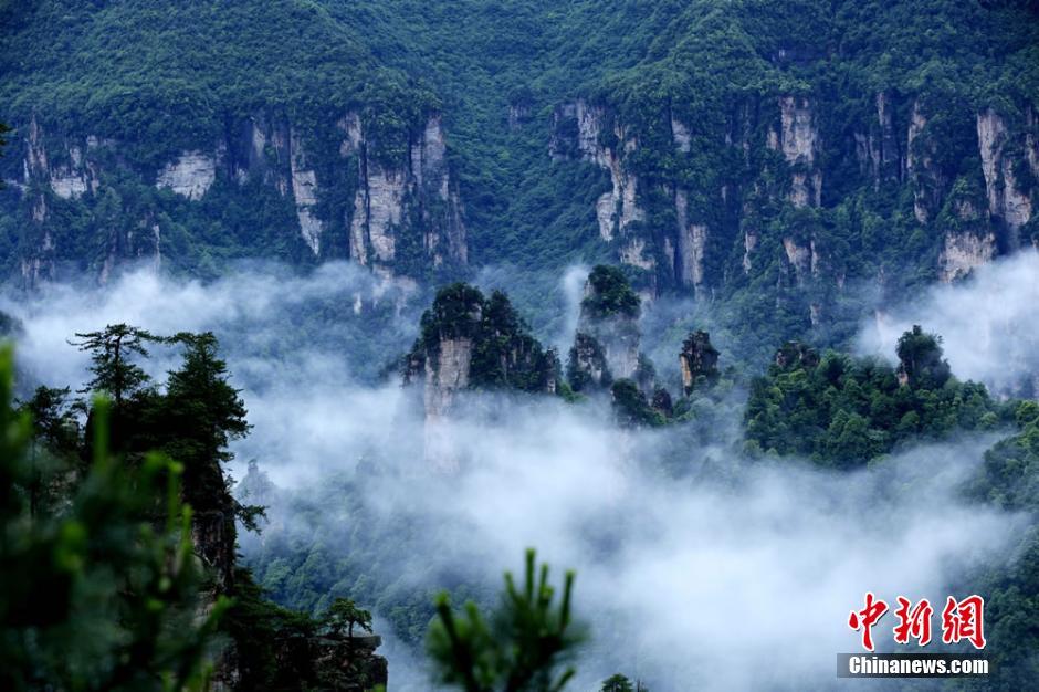 5月29日、湖南省張家界市で数日続いた豪雨が止み、世界自然遺産の武陵源天子山自然風景区にうっすらと雲海がかかった…