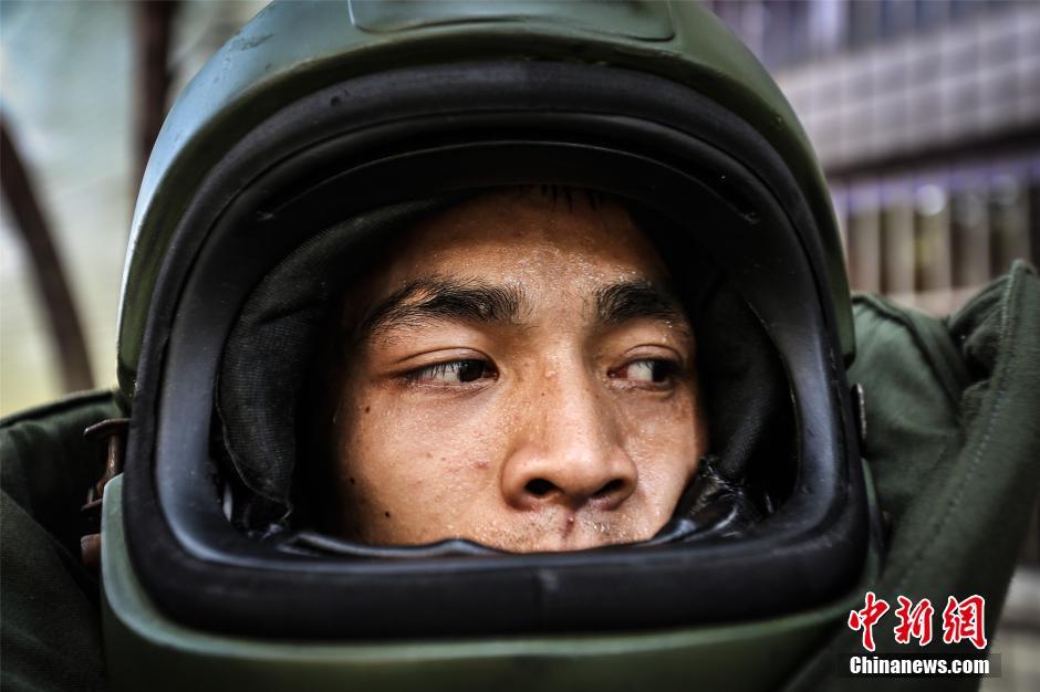 寧波武装警察、重さ35キロの対爆スーツを着て訓練