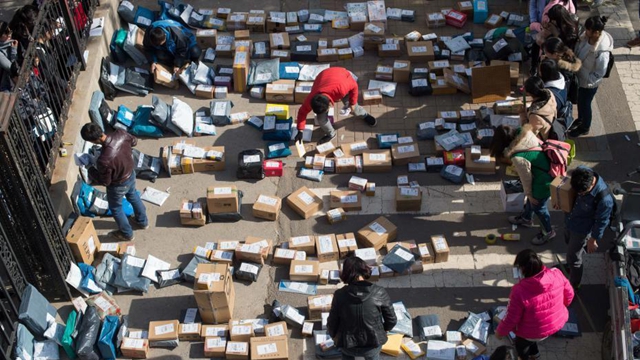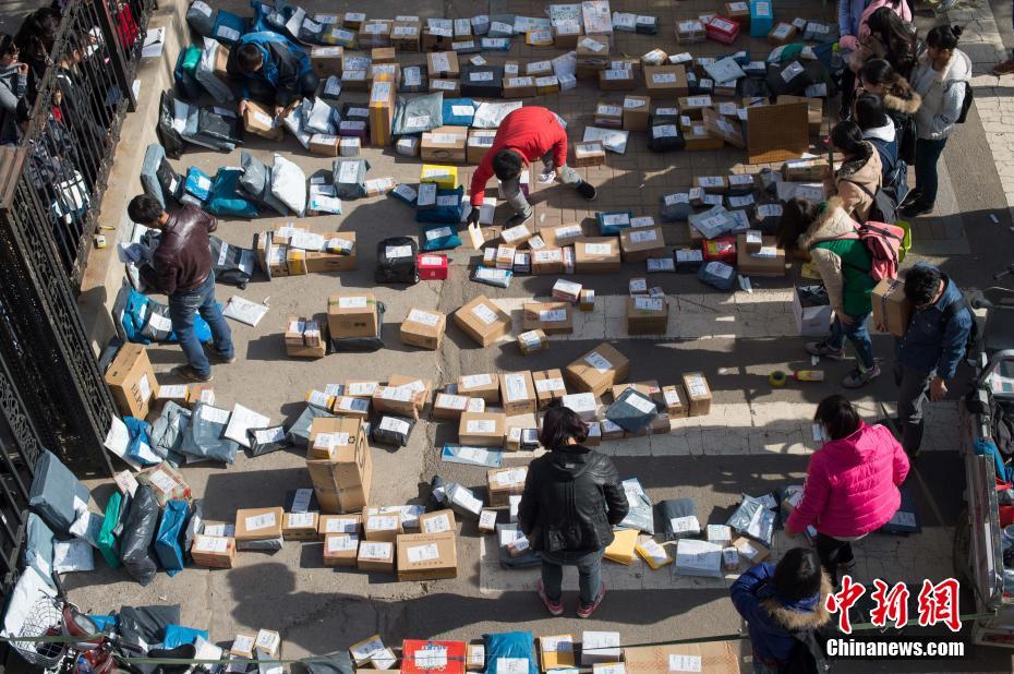 11月14日、山西省太原市の山西財経大学の校門に各宅配会社の宅配便が置かれ、配達員は忙しそうに学生たちがネット通販で購入した商品を渡した。ネット通販の大バーゲン「ダブル11」が終わり、中国各地は配達のピークを迎えている。写真は、忙しそうに地面に宅配便を並べる配達員。