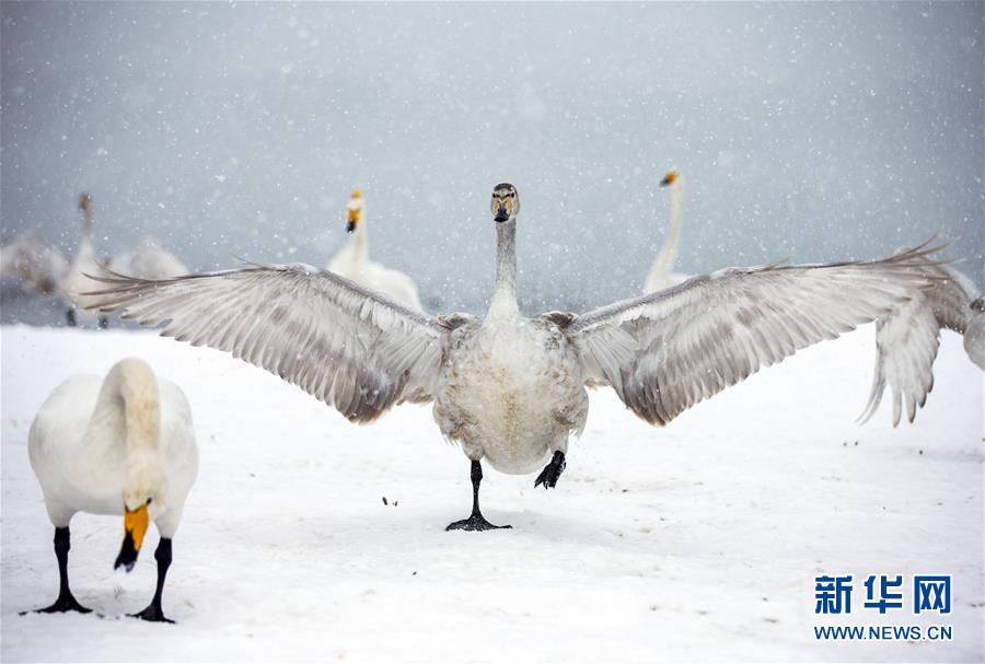 11月22日、雪の中で羽を広げるハクチョウ。同日、山西省の平陸三湾黄河湿地で初雪が降り、ここで暮らす野生のハクチョウは冬の湿地を味わいを添えている。