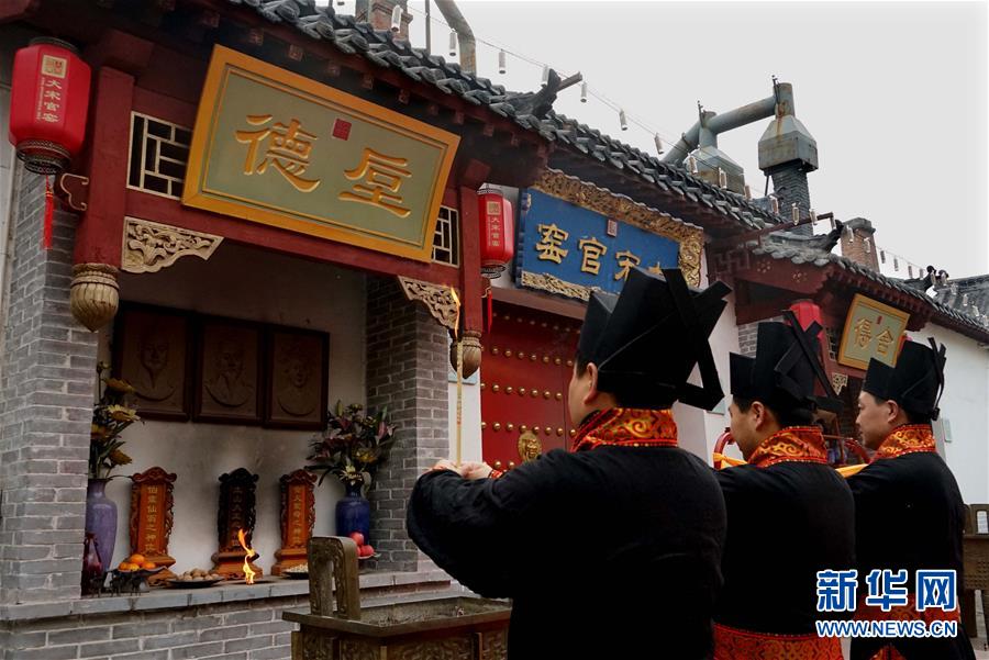 窯を明ける前に窯の神にお祈りする3人の鑑定人