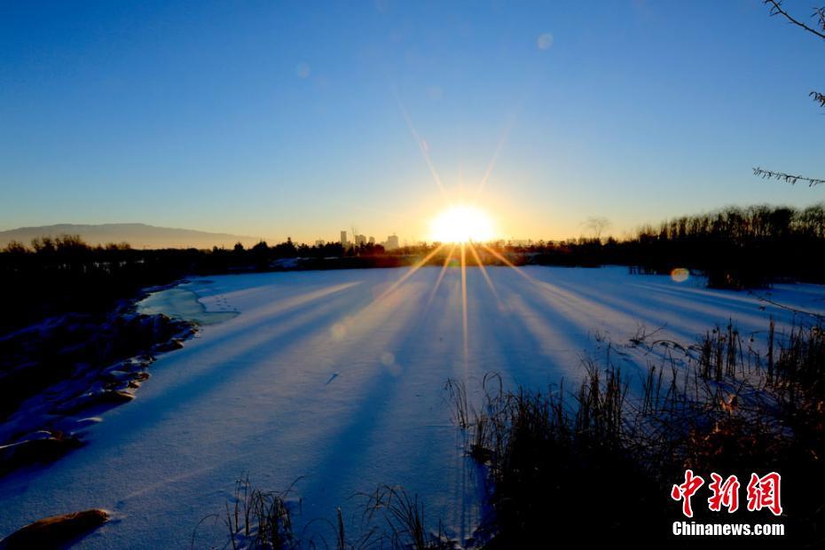 真冬になり、甘粛省の河西回廊に位置する張掖浜河新区で雪が止み、人工湖は真っ白な雪に覆われた。透き通った氷瀑、つららは冬の美しい風景となっている…