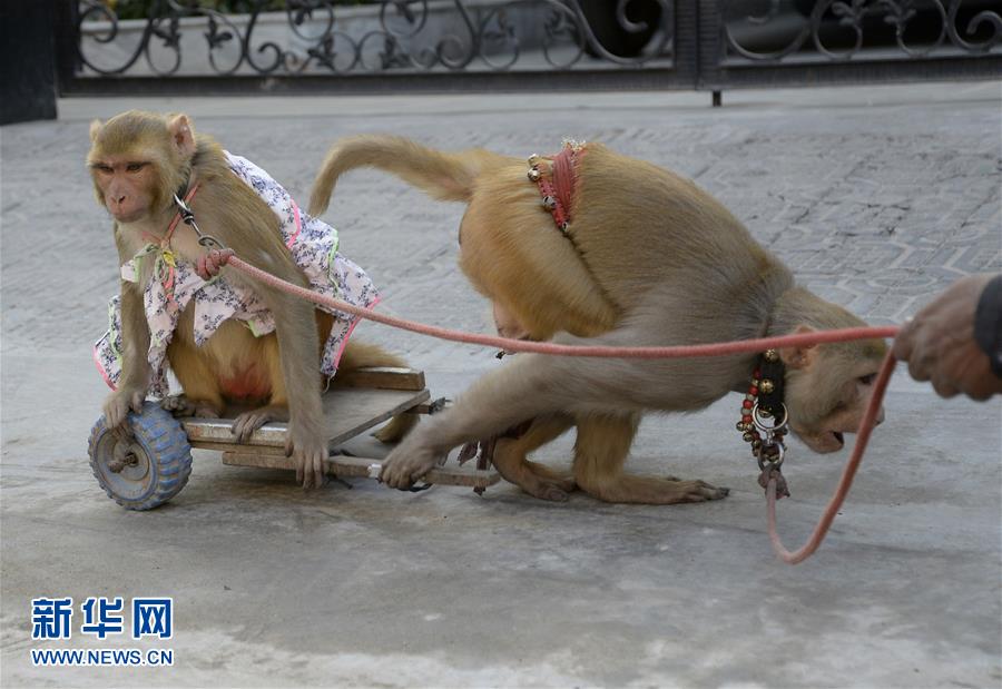 12月25日、インドのジャランダルで、パフォーマンスを終えてサルと共に移動する猿使い…
