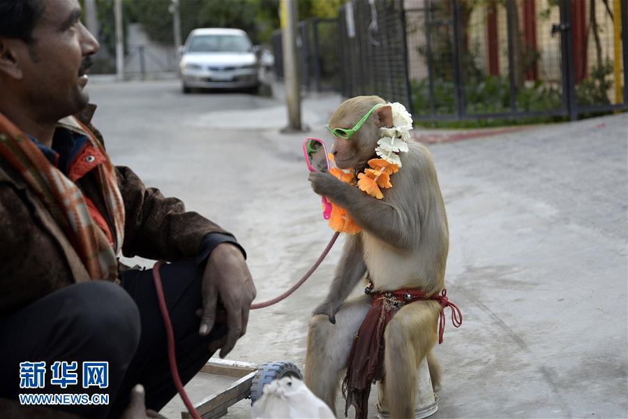 12月25日、インドのジャランダルで、パフォーマンスを終えてサルと共に移動する猿使い…