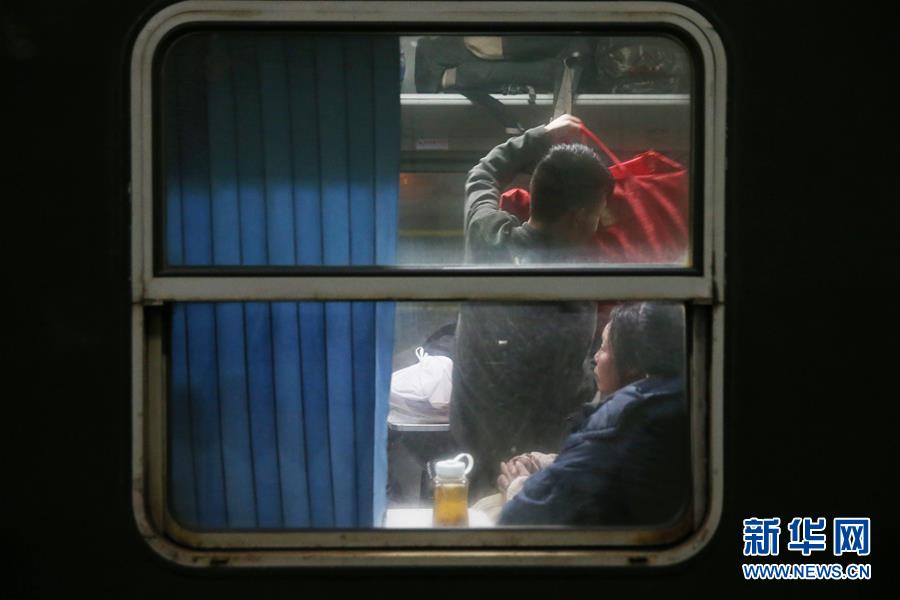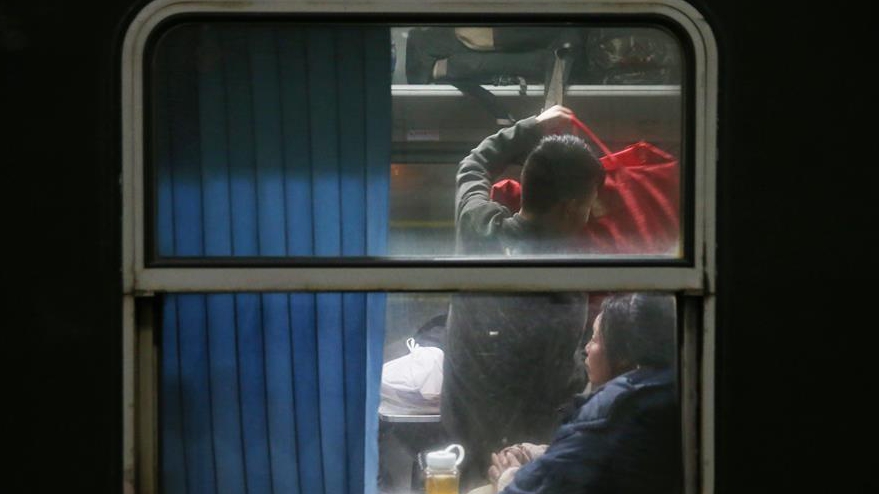 1月13日早朝、旅客が上海南から重慶北に向かう列車内に荷物を置く。この列車は「春運」(旧正月前後の帰省ラッシュ・Uターンラッシュ)期間の、上海発の1本目となった。13日より、今年の40日間の春運が始まった。期間中の全国旅客輸送量は、前年同期比2.2%増の延べ29億7800万人になる見通し。