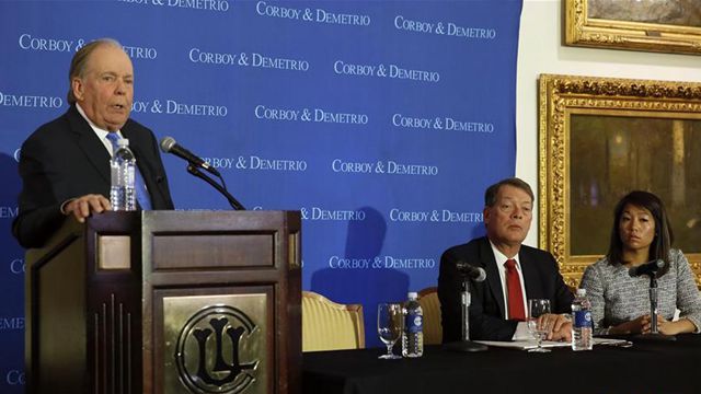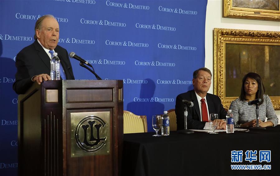 4月13日、シカゴで記者会見を開く、ユナイテッド航空に飛行機から引きずり下ろされたベトナム系米国人の代理人を務める弁護士のトーマス・ドメトリオ氏(左)、スティーブン・ゴラン氏(中央)と怪我をした乗客の娘