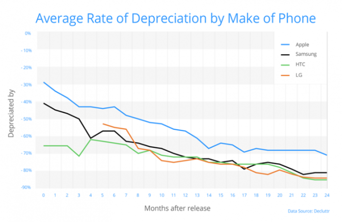 「Decluttr.com」は、各メーカーの携帯電話の価値低下速度を統計化した。グラフを見ると、アップルのiPhoneは他メーカーの携帯電話より価値低下が遅いのがわかる。また、サムスンの携帯電話の「価値維持率」はLGやHTCより高い。