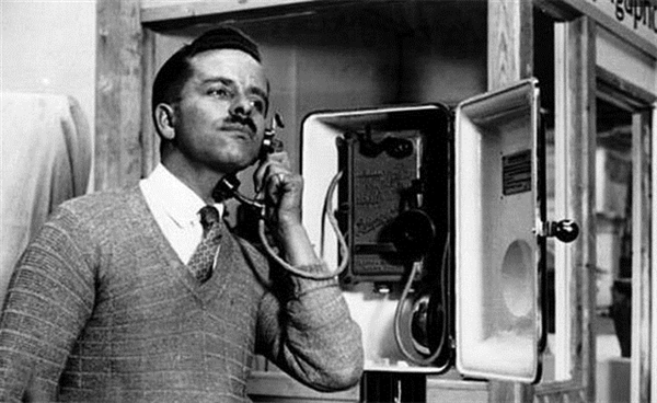 1929年に発明された神秘的な電話。喉に受話器を当てて使い、声帯の振動で通話する