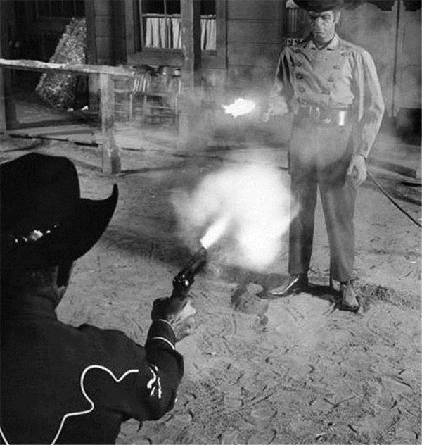 ロボットの銃撃戦。2体のロボットが本物の拳銃を持って打ち合う