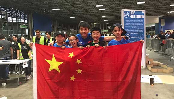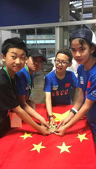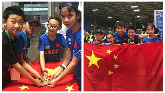 コロンビアのメデジンで5月13日に幕を下ろした2017年ロボレーブ国際大会の決勝で、平均年齢12歳以下の中国の小学生4人によるチームが優勝した。写真は、優勝した中国の小学生4人(左から順に許成易さん、馬天岳さん、季天澤さん、陳亮熹さん)