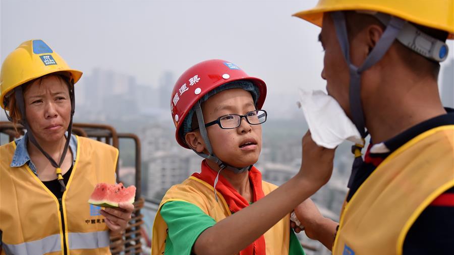 出稼ぎ労働者の子女約50人が同日、親が働く北京市亦荘の中建二局一公司の建設現場を見学し、高温の中で働く親の大変さを体験した。